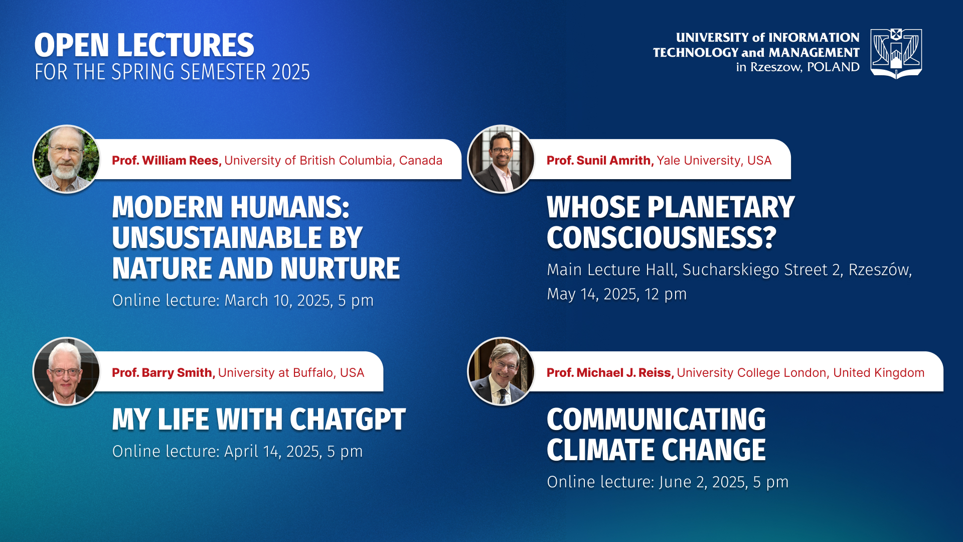The University of Information Technology and Management in Rzeszów invites you to a new series of open lectures. The sessions will be led by renowned and respected professors from Canada, the USA, and the UK. Invited speakers will present topics related to climate change, artificial intelligence, and planetary awareness.