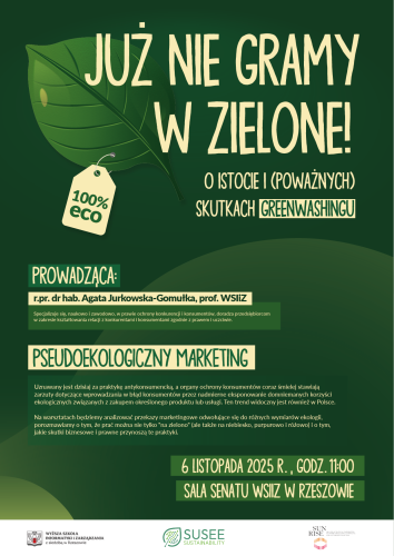 The first workshop, entitled “We’re not playing green anymore! The essence and (serious) consequences of greenwashing,” will be led by JC Agata Jurkowska-Gomułka, Ph.D., Assoc. Prof.