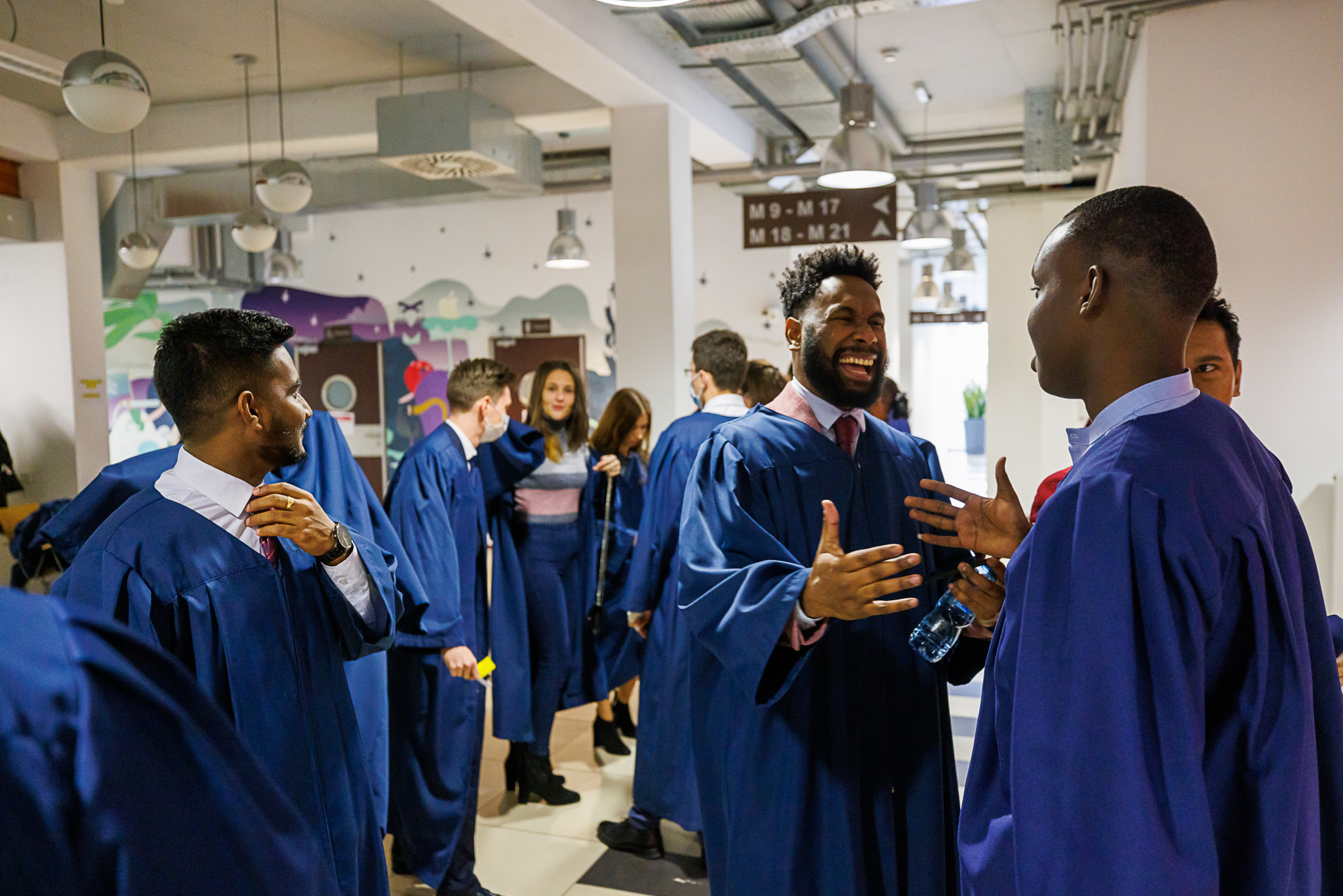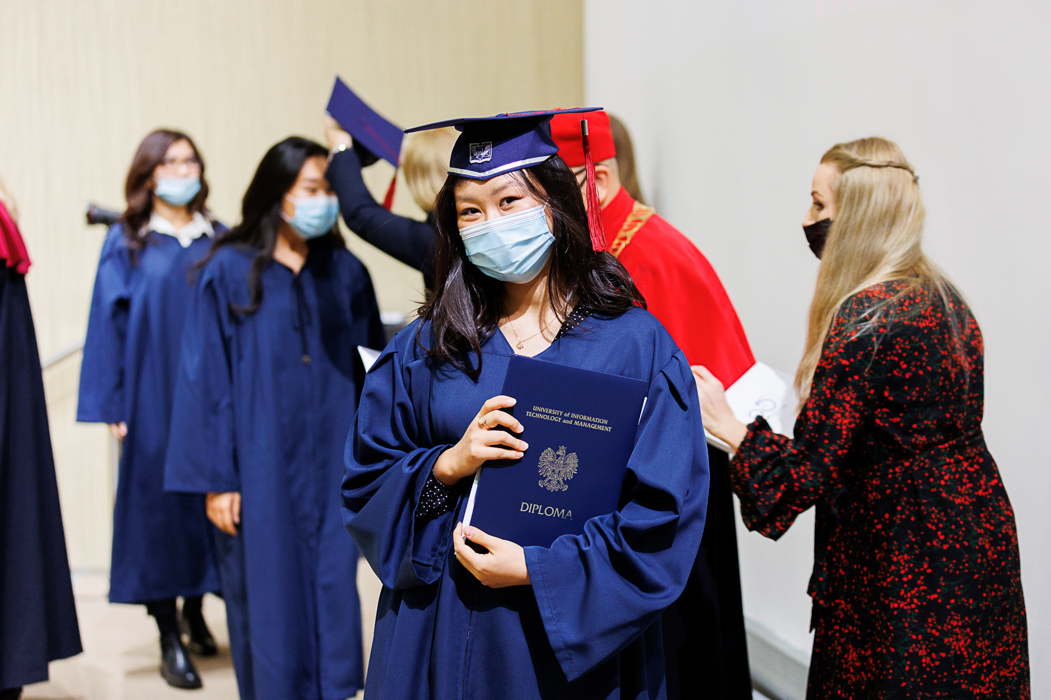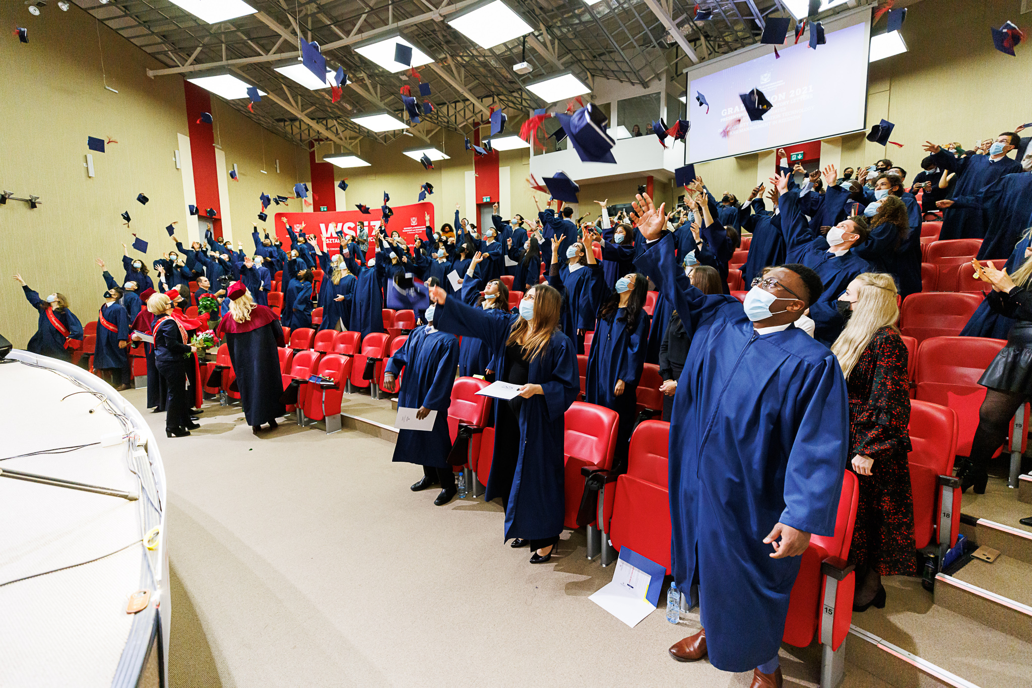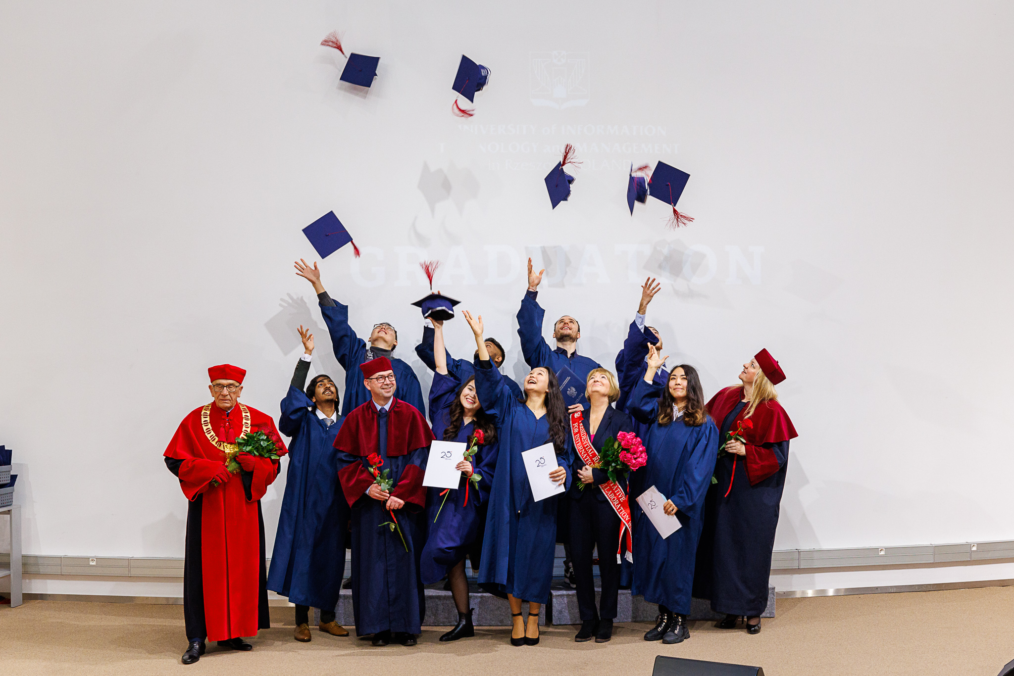 The artistic part of this year’s Graduation was a performance by Alicja Wróbel, a student of Psychology in Management, winner of the international competition „UITM’s got Talent” in 2019, awarded, among others, in the national competition „Wygraj sukces”. During Graduation, there was a traditional Mexican wave, joint commemorative photo sessions and biretta tossing. The official part was followed by a Toast with the University Authorities and refreshments provided by the UITM Alumni Club.
