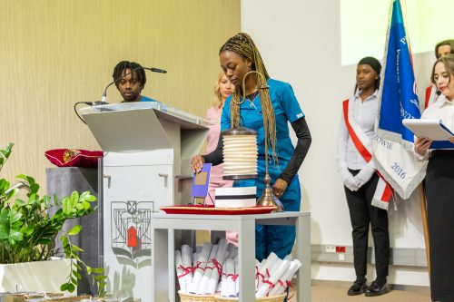 Top-performing students were awarded, including Kariri Panashe, Joanna Szaro, Kunashe Charamba, and Patrycja Czopik. Their academic excellence was met with loud applause, flowers, and tears of joy from friends and families.