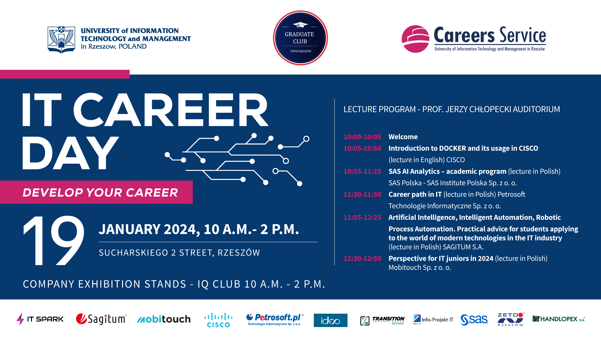 On January 19, 2024, at the main campus of the UITM, the „IT Career Day” will take place. The main theme of the event will be professional development opportunities in the IT industry. The event is organized by the Careers Service, and the Alumni Club operating at UITM.